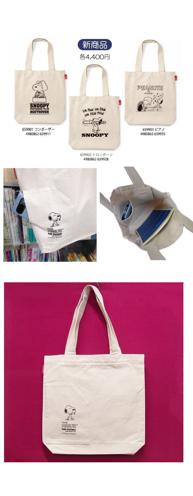 スヌーピー柄のトートバッグが新発売‼️ ✅厚手のキャンパス生地 ✅マチあり ✅ポケット×3 丈夫で収納力抜群✨ A4サイズを入れても余裕があります👌 サイドのルーポケットは出し入れの多い小物の収納にとっても便利ですよ~🤩(画像2・3※絵柄共通)