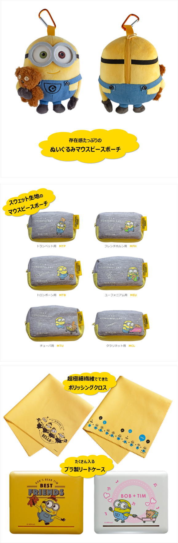 「ミニオン」グッズが増えました🎶 💛ぬいぐるみマウスピースポーチ…3,080円 💛マウスピース用スウェットポーチ…全6種/各2,420~2,750円 💛ポリッシングクロス…全2柄/各1,760円 💛プラスチック製リードケース…全2柄×3種/各3,630~3,740円 どのアイテムも、とっても可愛いですよ~🥰