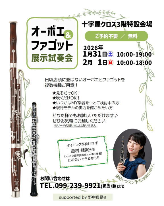 『オーボエ&ファゴット展示試奏会』開催‼️ オーボエ と ファゴット をloveな皆様、1/31&2/1はぜひ当店に遊びに来てください🤩 見るだけ🆗吹くだけ🆗🎶 購入のご相談はもちろん大歓迎✨どんなことでもお尋ねください。 知り合いの方にも、シェアしてくださると嬉しいです🥰 お問合せなどありましたらお気軽にお電話ください📲