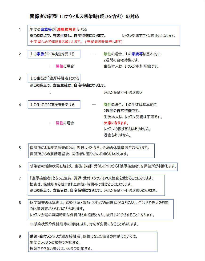 ※レッスン生徒または同居のご家族の方が感染した場合や濃厚接触者に特定された場合は、感染防止拡大の為に、レッスンの受講をお控えいただき、担当講師またはレッスン会場受付に必ずお知らせください。