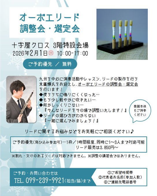 九州を中心にご活躍の末廣輝さんをお迎えし、リードの調整&新しいリード選びのお手伝いをいたします💁
