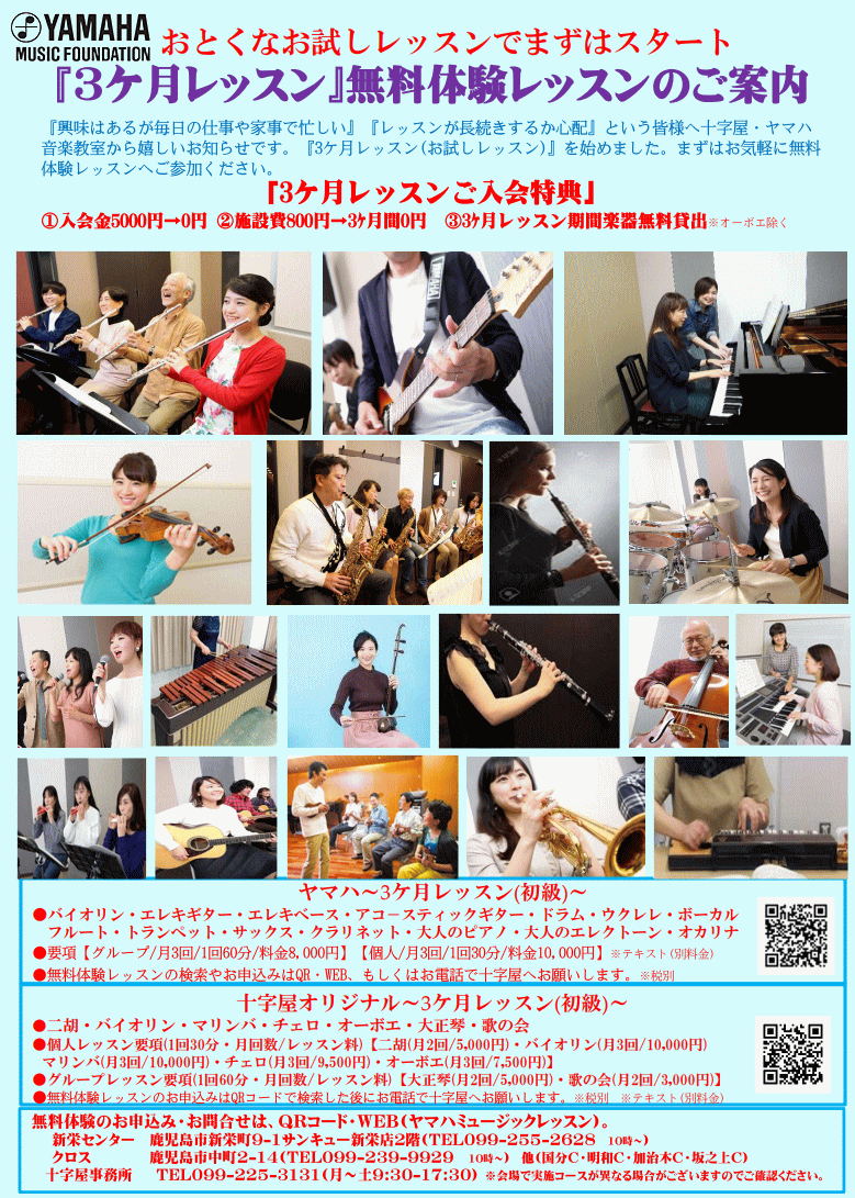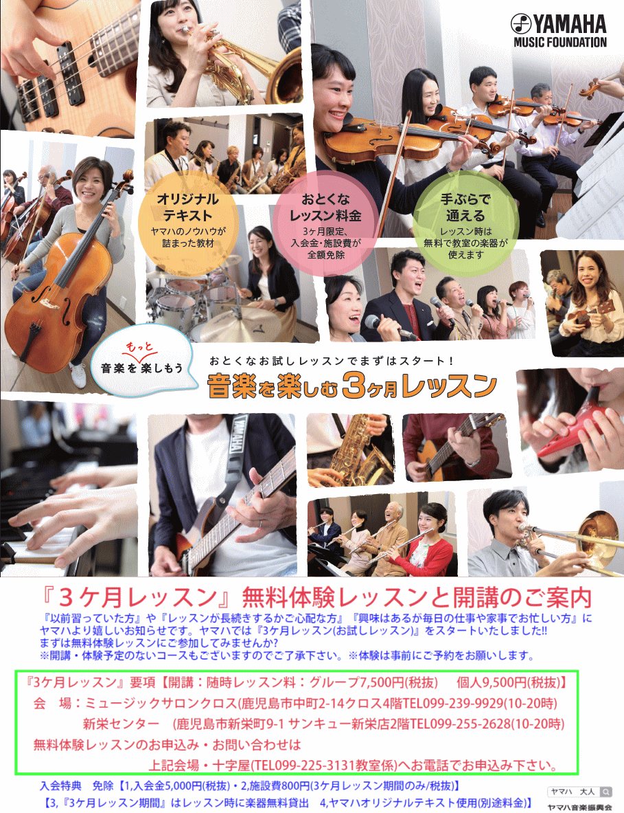 音楽を楽しみたい方にまずは3ヶ月、入会金・施設費が無料で気軽にお通いいただけるレッスンです。グループレッスン 1回60分の月3回・個人レッスン 1回30分の月3回
